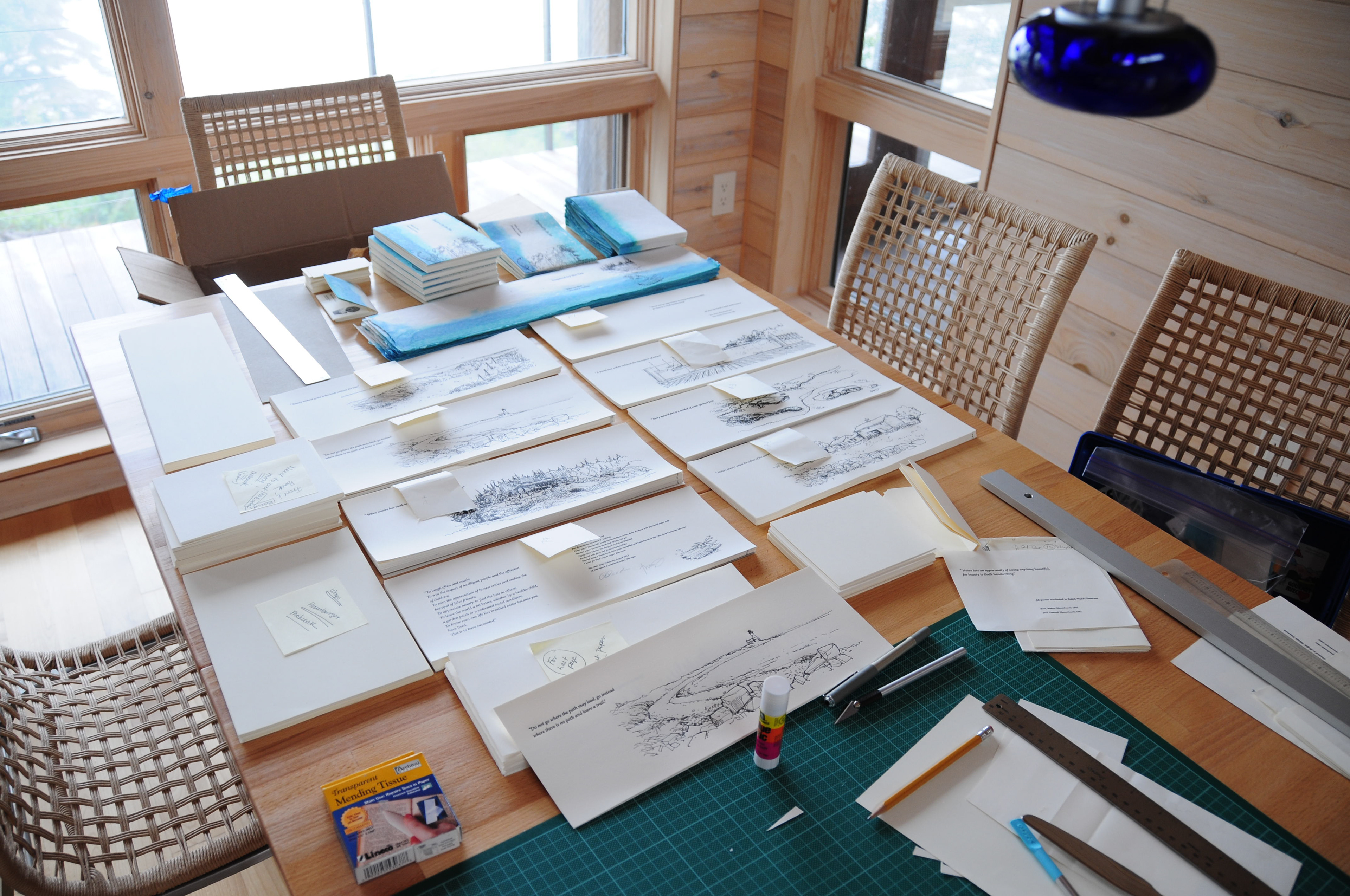 Robin Lee Reed and Thornton K. Lothrop collaborated on this handmade art book made with paper produced from heirloom table linen originating from the early mills of Rhode Island. It is in homage to the artists’ New England cultural heritage and inspired by photographs. Design & images: Robin Lee Reed Pen illustrations: Thornton K. Lothrop Cover paper: Handmade family heirloom linen, cotton linter & abaca with pigmented paper pulp Quotations: Selected from the writings of Ralph Waldo Emerson (1803 – 1882), a native of New England Typography: Minion Pro designed by Robert Slimbach Production: Films and photo-polymer plates Printing: Vandercook letterpress Concertina fold: hand bound and assembled at the Center for Book Arts & Logan Elm Press at The Ohio State University.